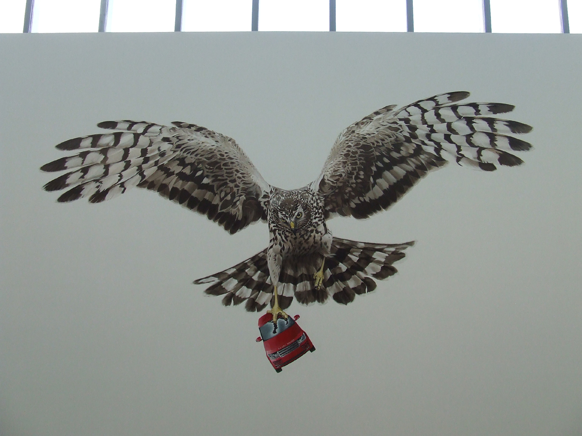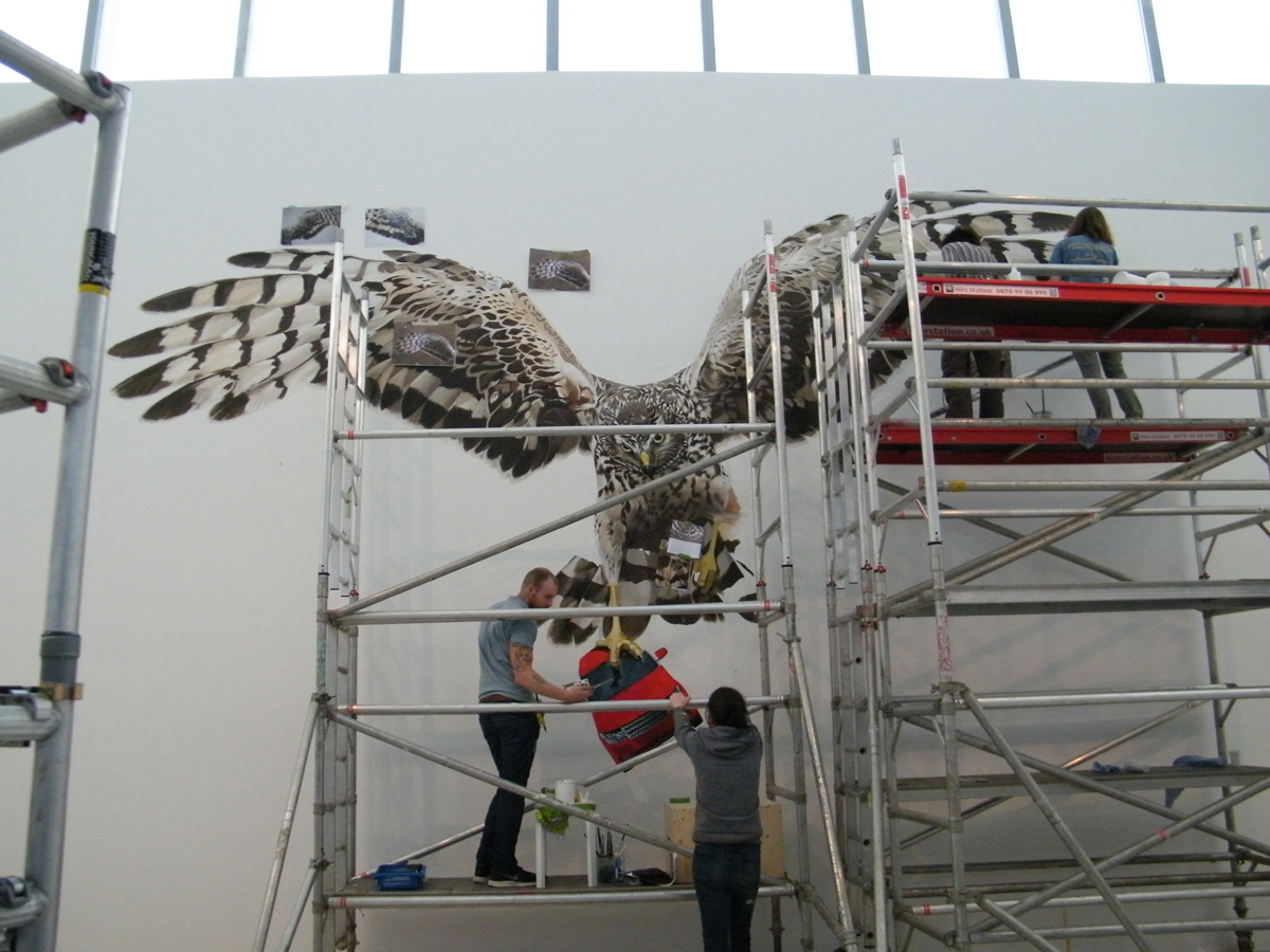 This is Sarah Tynan’s Hawk with it’s four wheel prey. The image below shows the mural in progress.