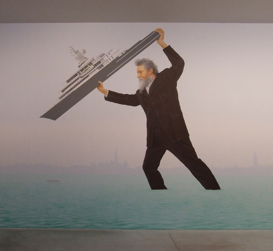 This wonderful image was created by Stuart Sam Hughes. It shows William Morris as a giant throwing a ‘super yacht’ (belonging to Roman Abramovich) into the Venice Lagoon. Jeremy had visited Venice for the previous Biennale and was annoyed that Roman had parked his yacht thus obscuring the view. So take that you naughty Oligarch!