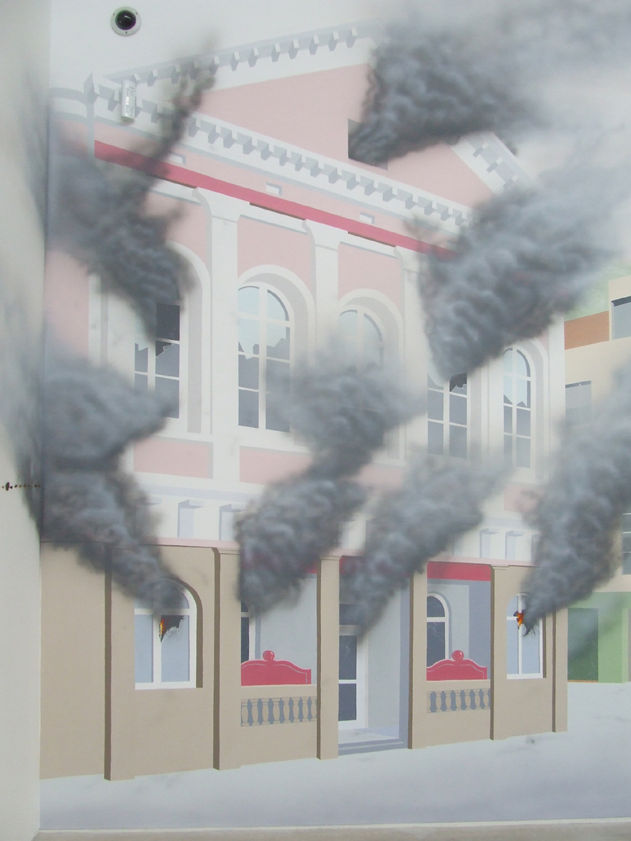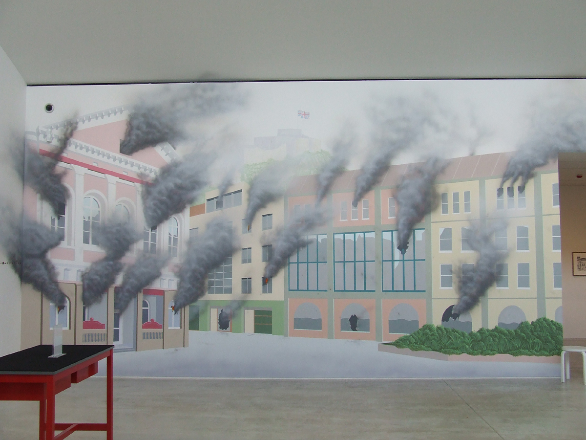 A very tight deadline ( two weeks) and a great group of collaborators produced this image of the offshore tax haven of St Helier Jersey on fire after a fictitious riot. The mural occupied two walls 18 feet high. Many thanks to the skilful team, Joseph, Mandy, Jo, Matt, Raliat, Stacy, Kelly, Lucy, Greg and Dan, not forgetting Andy. The mural was designed by Stuart Sam Hughes and had previously been painted in Venice at the Biennale, The William Morris Gallery, and Bristol. Margate was the last Venue. The British Council commissioned the show.