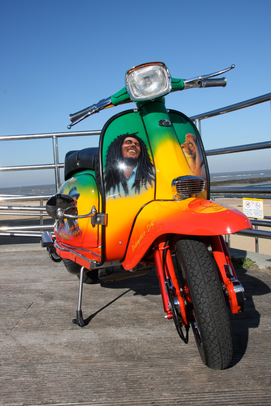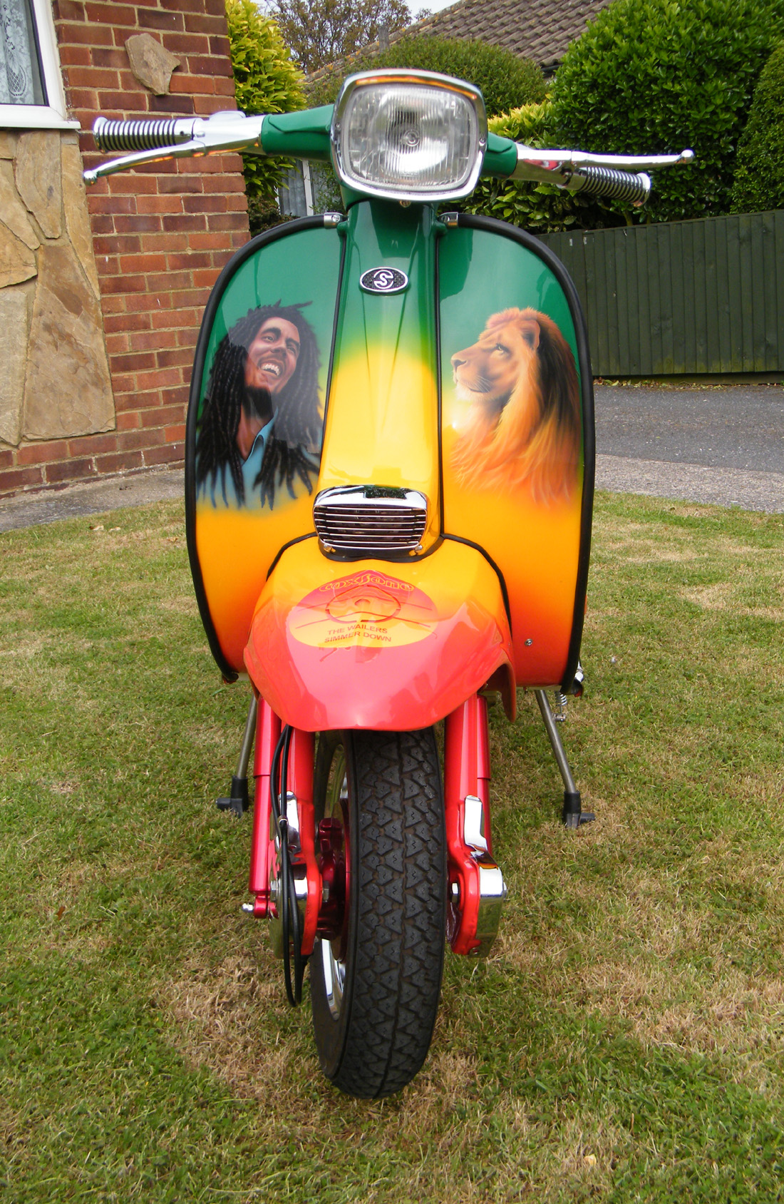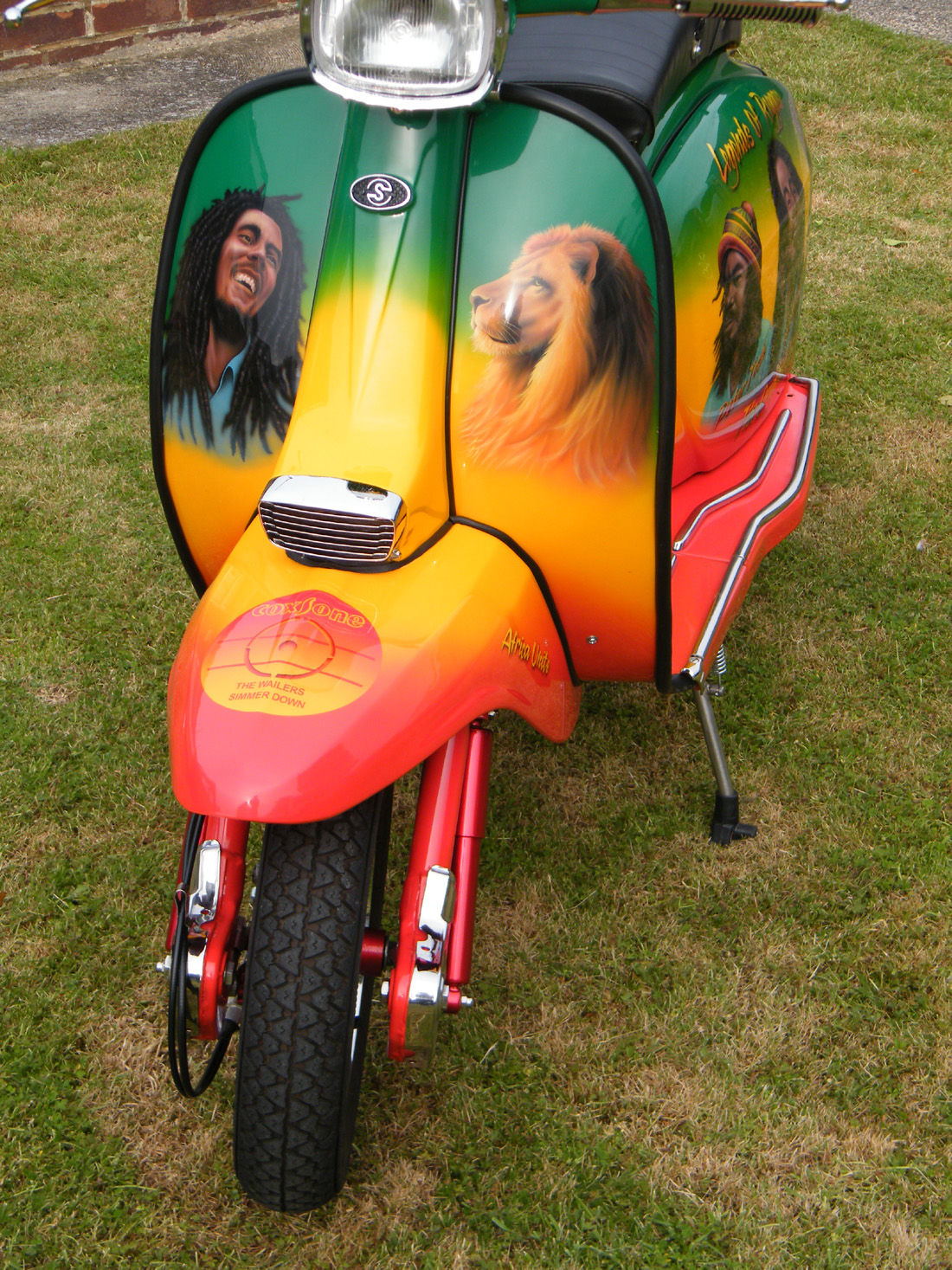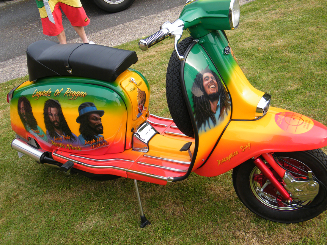 This Customised Lambretta was commissioned by Paul ‘Chappy’ Chapman and is his vision of a tribute to the legends of Reggae. The body work restoration and finish are by Kevin at the Bike Clinic. The work took about seven months and has won numerous awards at rallies around the country.
