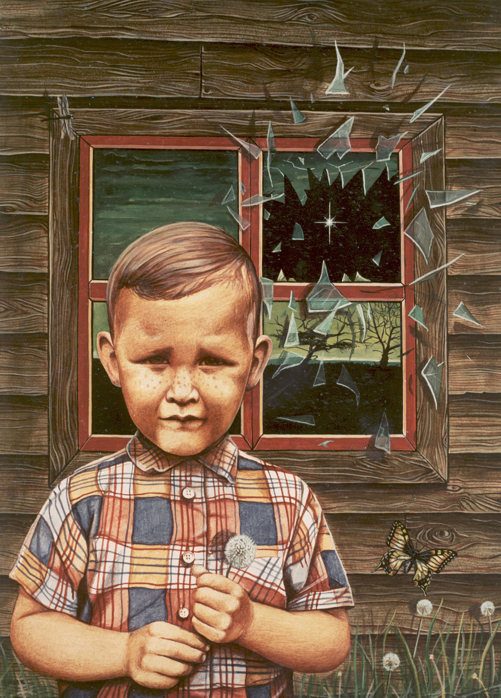 This image was produced specifically for my portfolio shortly after leaving Canterbury in 1978 and was not published. It is an imaginary book cover. The idea is based on a short story of a boy and a ghost, the author of which I forget but I seem to remember it had a strange atmosphere and was not a ‘scary’ type story. The boy image is in fact yours truly, from a photograph taken in Canada around 1957. Again this is before my transition to airbrush, and a friend commented that it had a Grant Wood, Andrew Wyeth quality. Fine by me.