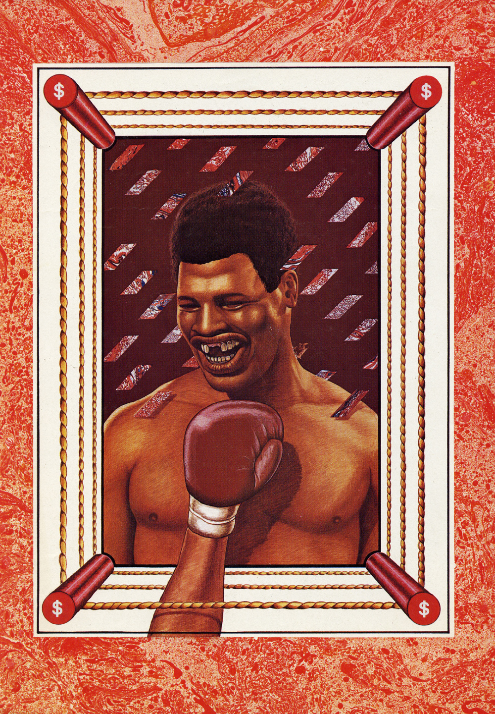 This piece was commissioned by Paul Raymond Publications and appeared in either ‘Men Only’ or ‘Club International’ sometime in 1978 (my printed proofs don’t have exact dates). I was given an open brief, a blank page as it were (my favourite kind of brief). The article in the magazine (yes, gentlemen’s magazines actually had editorial content in those days) comprised an interview with the American boxer Leon Spinks. Leon had been in the news after being arrested for possession of drugs which he hid under his hat. Sadly he became a figure of fun in the media despite winning a bout with Muhammad Ali to become undisputed World Heavyweight Champion, which was short-lived. My initial ideas involved images of the hat and drugs but I elected to remove the obvious literal references and concentrate on the idea of ‘blood money’ which of course is what boxing and drug culture represent. I was pleased with the result and the Peter Blake influence is obvious. This was also before I started using the airbrush. The red marbling border was made by spraying Humbrol spray enamel onto water in the bath and lifting off with paper. A trial and error process until a promising sheet is produced and the frame shape cut out. So in fact the artwork is part collage.