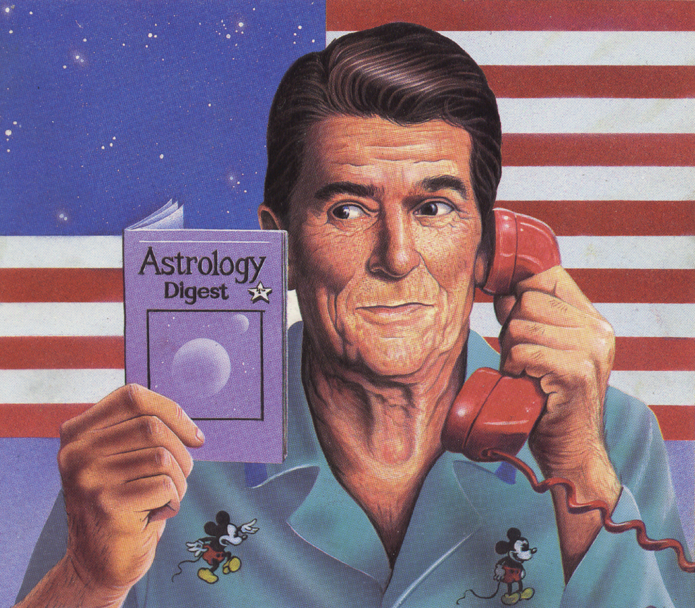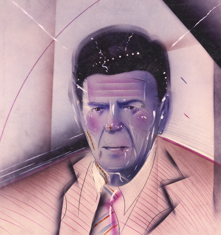 A tale of two Ronnies. Ronnie number one is unpublished. Ronnie number two was published on the cover of the East Bay Express around 1989. I gave the art director Steve Abel the choice and he plumped for the more conservative caricature, it’s daft and friendly. Ronnie number one is darker and more of the style of New York magazines at the time. They would use more ironic and darker illustrators like Brad Holland or Sue Coe, the post punk style. I got the idea for Ronnie 1 after watching ‘Bride of Frankenstein’ on late night TV and it was also around the time that the actual Ronnie announced the ‘Star Wars’ program. The idea for Ronnie 2 was based on the idea that Nancy Reagan was into Astrology and would advise Ron on stuff based on readings. I would have liked Steve to have used Ronnie 1 and it would have bolstered my post punk credentials especially amongst my musician friends. But since I was never a punk I could never cut it as a post punk. Besides, I’m a nice person.