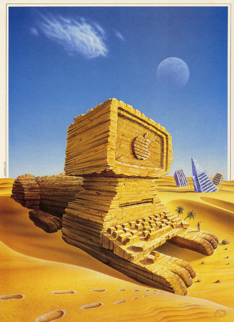 The idea here started as simply a computer emerging from the sand (time). Then it became a stone computer and it was only a short jump to the Sphinx (mystery). As would often happen during my creative process something else would present itself in association, in this case ‘Planet of the Apes’ on TV. So a multi-layered meaning emerges and also something absurd and amusing. Poor old Indiana had to shovel all that sand. I know the feeling.