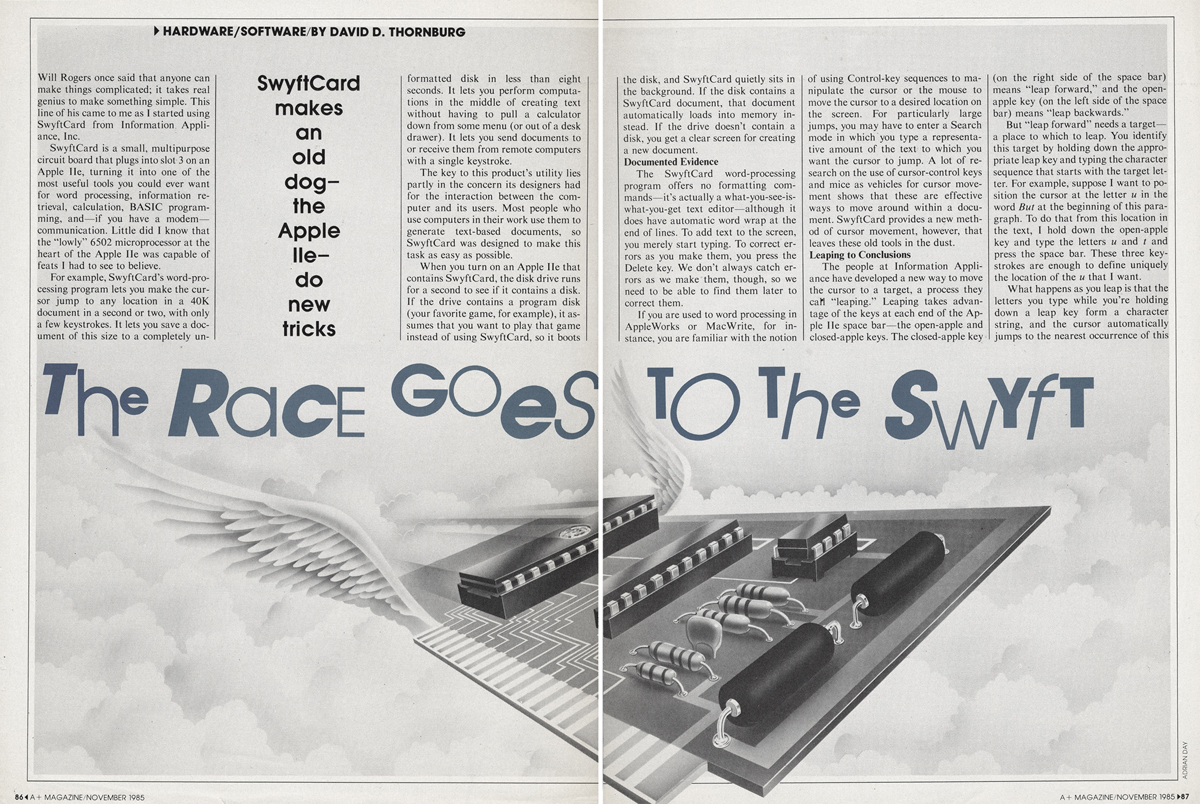 Peter Tucker moved from Miller Freeman in San Francisco to Ziff Davis Publishing in Palo Alto to set up A+ Magazine and he was very loyal to his team of various suppliers. I always looked forward to a call from him because he always gave me total freedom and a full blank page. He found it amusing that I had no clue about computer culture and my hybrid style was flexible enough to add extra interest to what seemed to be some fairly dry subject matter. Also there was a concern not to make the images ‘dark’ in tone. This seemed to be a move away from the edgy 1984 Ridley Scott ad that was playing on TV and in cinemas.